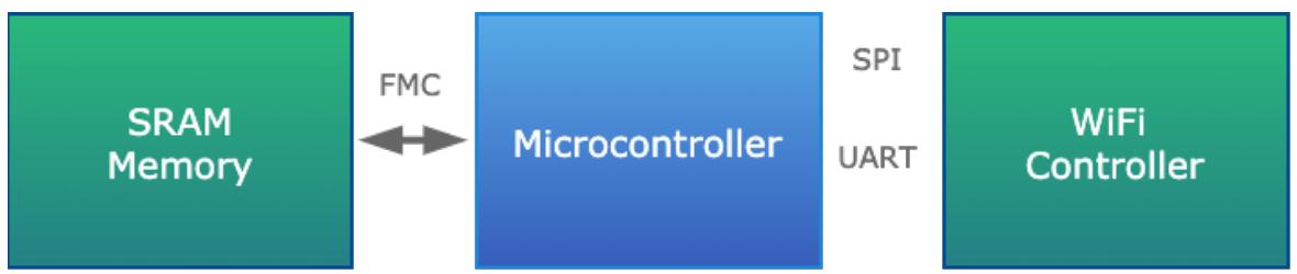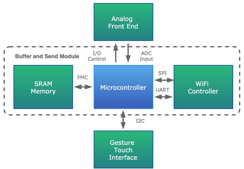 缓冲发送系统:将缩放后的输入信号转换为数字数据,将采样的电压数据存储在 SRAM 缓冲区中,并在存储器缓冲足够数据后传输这些样本。这部分主要涉及三个组件:微控制器的内部 ADC、存储器和 WiFi 模块。