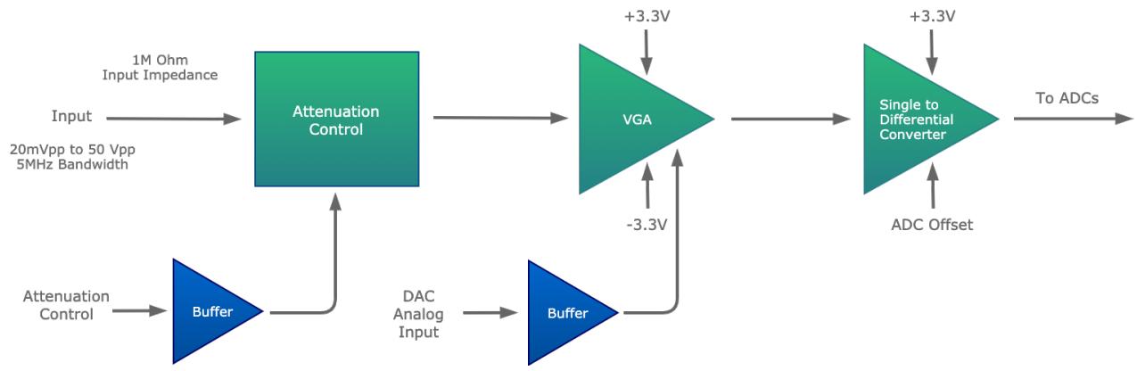 受之前工作 [4] 的启发,模拟前端(AFE)由图 2 所示的模块组成。该子系统的目标是处理任意输入信号,使其与我们 ADC 的电压范围兼容。鉴于标准示波器应能在不失真的情况下接收任何任意信号(在电压限制和带宽范围内),这一级的设计必须尽可能减少噪声或失真的引入。AFE 由三个阶段组成:衰减器、可变增益放大器(VGA)和单端转差分转换器(SDC)。