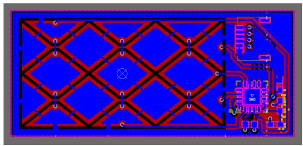 在电路板的第一次迭代中,我们观察到了地偏移现象 [9]。我们意识到,当笔由电源线供电时,触摸传感器工作完美;但如果我们断开电源线由电池供电,触摸传感器就会变得非常不稳定。地偏移现象可以通过增加触摸板与局部地之间的寄生电容来抵消,这样即使移除了大地,寄生电容也不会发生大的变化。具体而言,这可以通过在每个菱形区域下方放置一个局部地来实现,如图 6 所示。