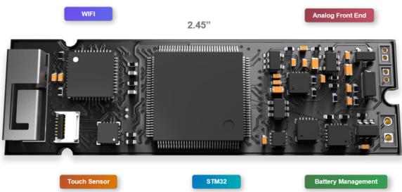 为了进一步缩小电路板尺寸,我们在电路板两侧都布置了组件,将电阻和电容等被动组件放置在主动芯片下方。总的来说,电路板可以分为三个区域。左侧最密集的区域是电源管理和模拟前端。中间部分被主微控制器占据,右侧部分包括触摸传感器连接器、WiFi 控制器和天线。完成后的电路板渲染图如图 8 和图 9 所示。