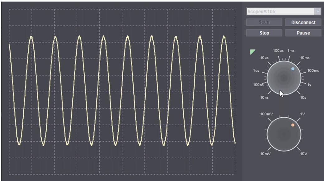我们还开发了一个用于显示样本的电脑端软件原型。我们遵循 MVC 设计模式。视图层基于 Java Swing 库开发。它被设计为具有示波器风格的用户界面,包括电压/时间旋钮等组件。模型层主要由两个类组成。一个是用于管理硬件连接的 CommManager,另一个是接收/传输并解码/编码控制指令的 CmdManager。控制器充当视图层和模型层之间的桥梁,并管理软件的状态机。在视图层发生的用户交互将向下传递,并由模型层类发送到 Scopen 硬件。同样,模型层接收到的数据/指令将向上转发,并最终显示在用户界面上。用户界面如图 12 所示。