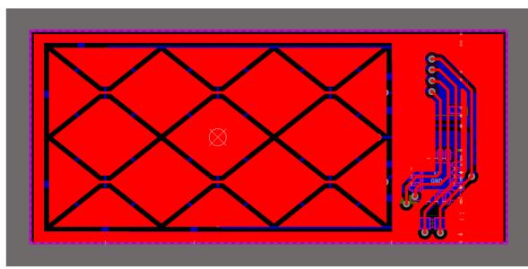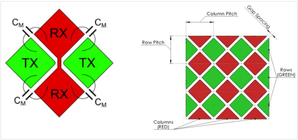 如图 4 [8] 所示,触摸板需要具有菱形形状,其中红色代表接收(RX)通道,绿色代表发送(TX)通道。对于我们使用的芯片,有 3 个 TX 通道和 2 个 RX 通道,因此我们设计了如图 5 所示的电路板。