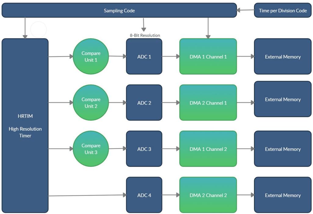 我们在开发系统时面临的一个关键挑战是如何设计四个 ADC 的触发器。我们的目标是以固定的时间间隔进行采样,以实现硬件部分描述的高采样率系统。由于我们使用了四个 ADC,我们无法利用 ADC 的主/从模式 [5],因为该模式仅限于两个 ADC。我们也无法使用中断,因为中断上下文切换需要时间,且确切耗时是不可预测的。我们的解决方案是使用高分辨率定时器(HRTIM) [5, 6, 10] 作为触发源,以控制 ADC 何时开始采样。每次采样完成后,DMA 将结果从 ADC 结果寄存器移动到外部 SRAM。图 11 展示了这一设计。